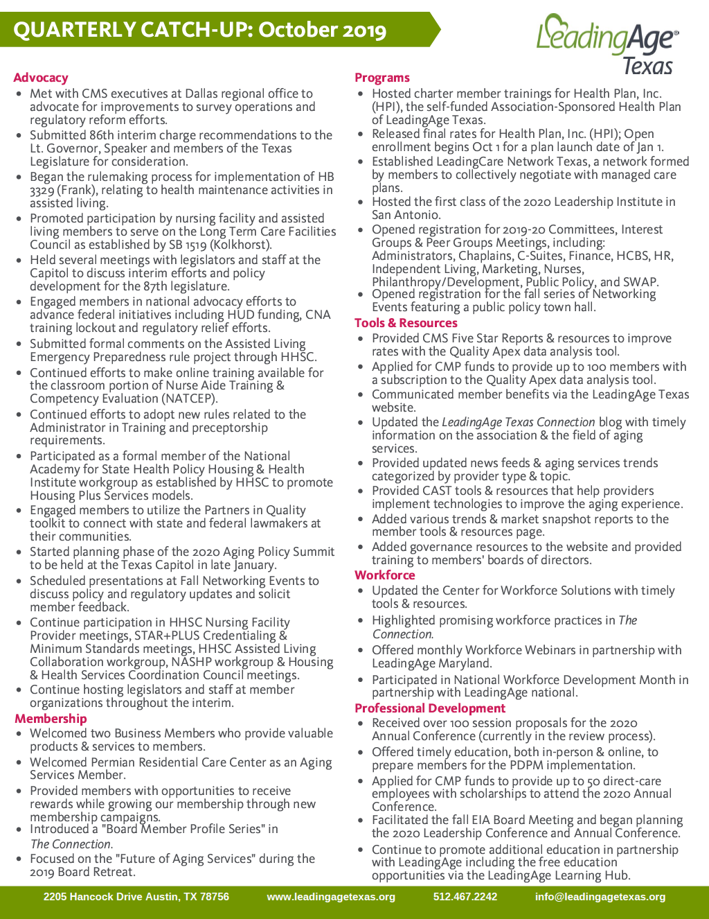 Click here to read an overview of our work for you in the third quarter of 2019.