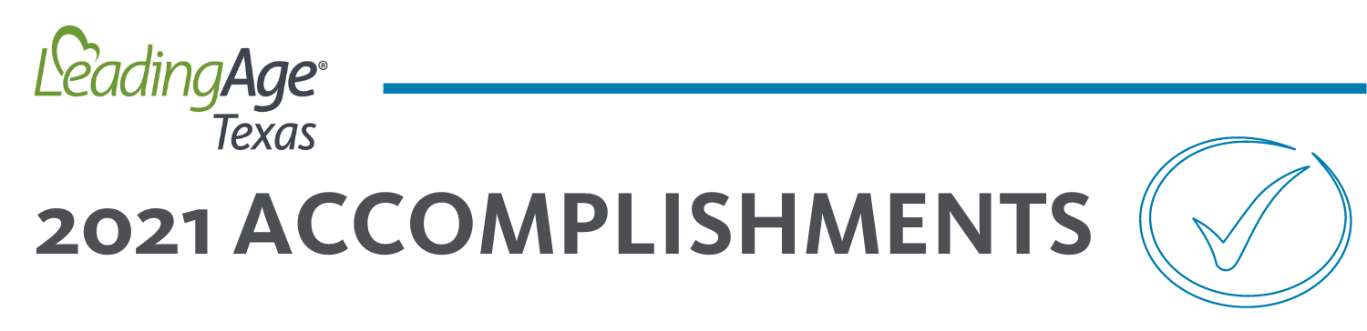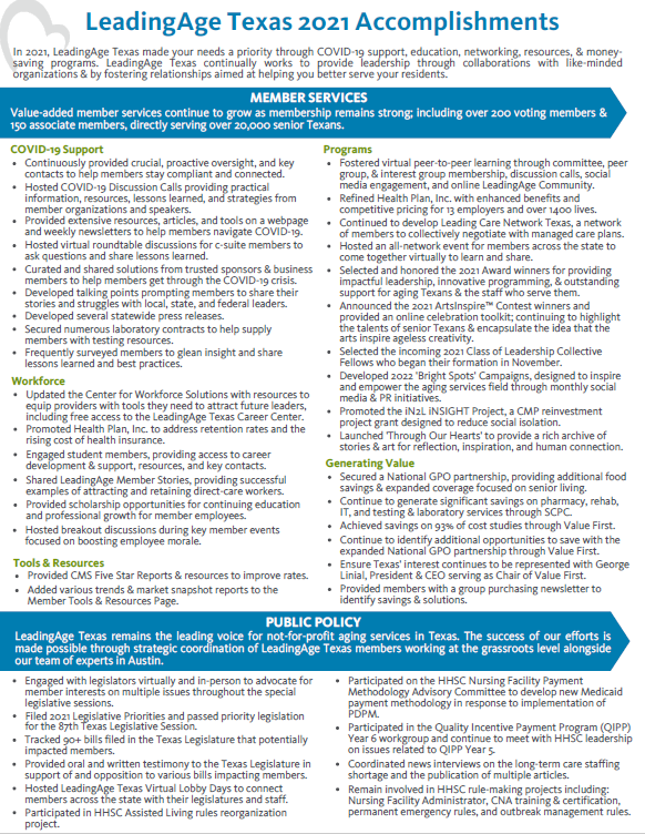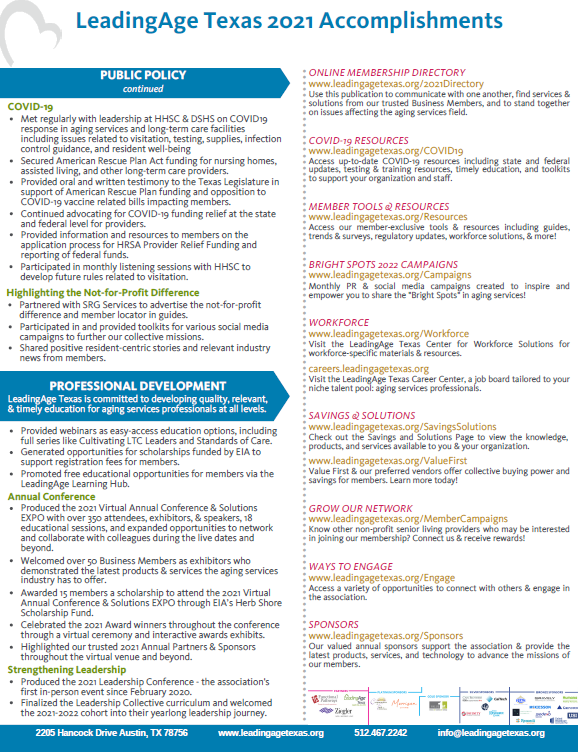 In 2021, LeadingAge Texas made your needs a priority through COVID-19 support, education, networking, resources, & money-saving programs. LeadingAge Texas continually works to provide leadership through collaborations with like-minded organizations & by fostering relationships aimed at helping you better serve your residents.