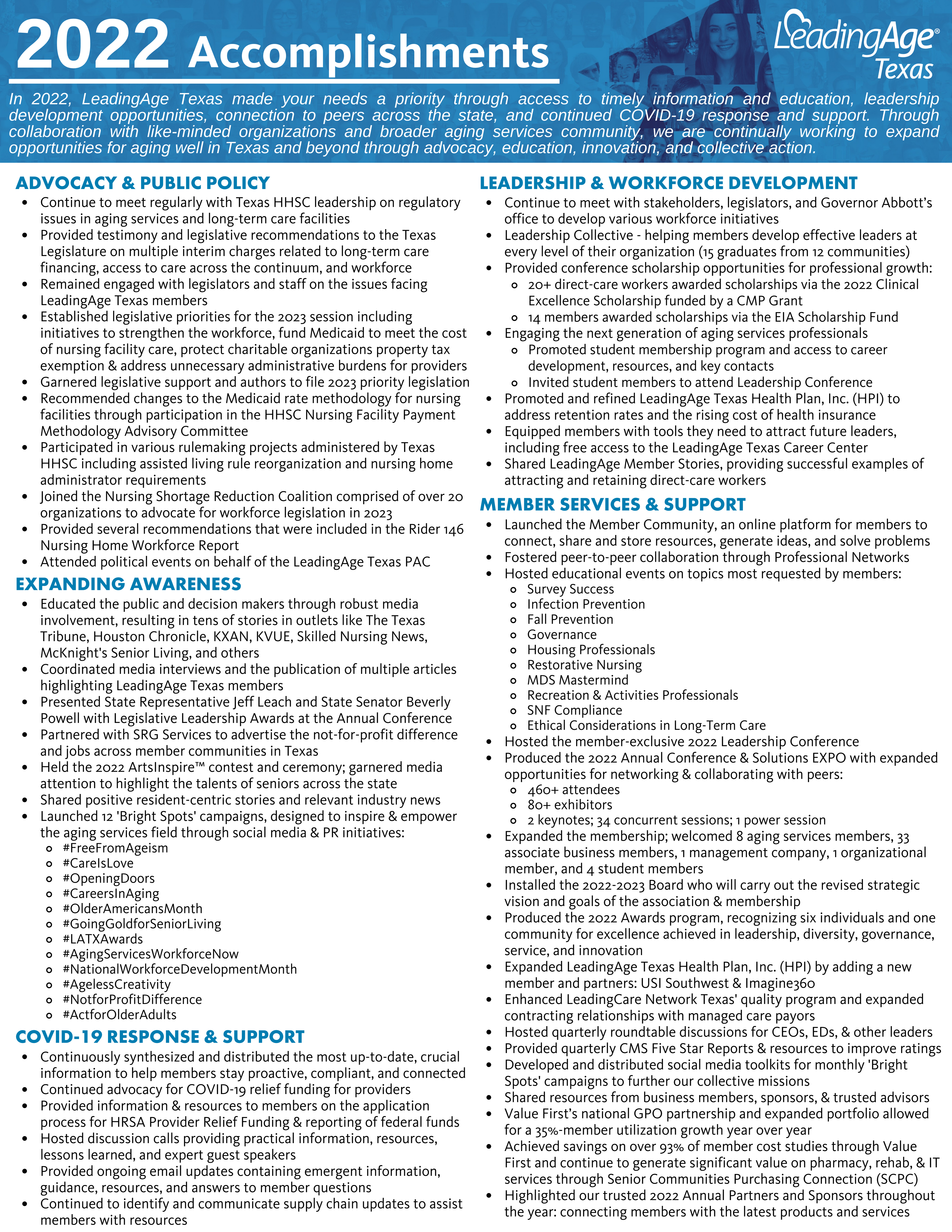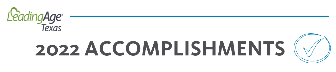 In 2022, LeadingAge Texas made your needs a priority through access to timely information and education, leadership development opportunities, connection to peers across the state, and continued COVID-19 response and support. Through collaboration with like-minded organizations and broader aging services community, we are continually working to expand opportunities for aging well in Texas and beyond through advocacy, education, innovation, and collective action.